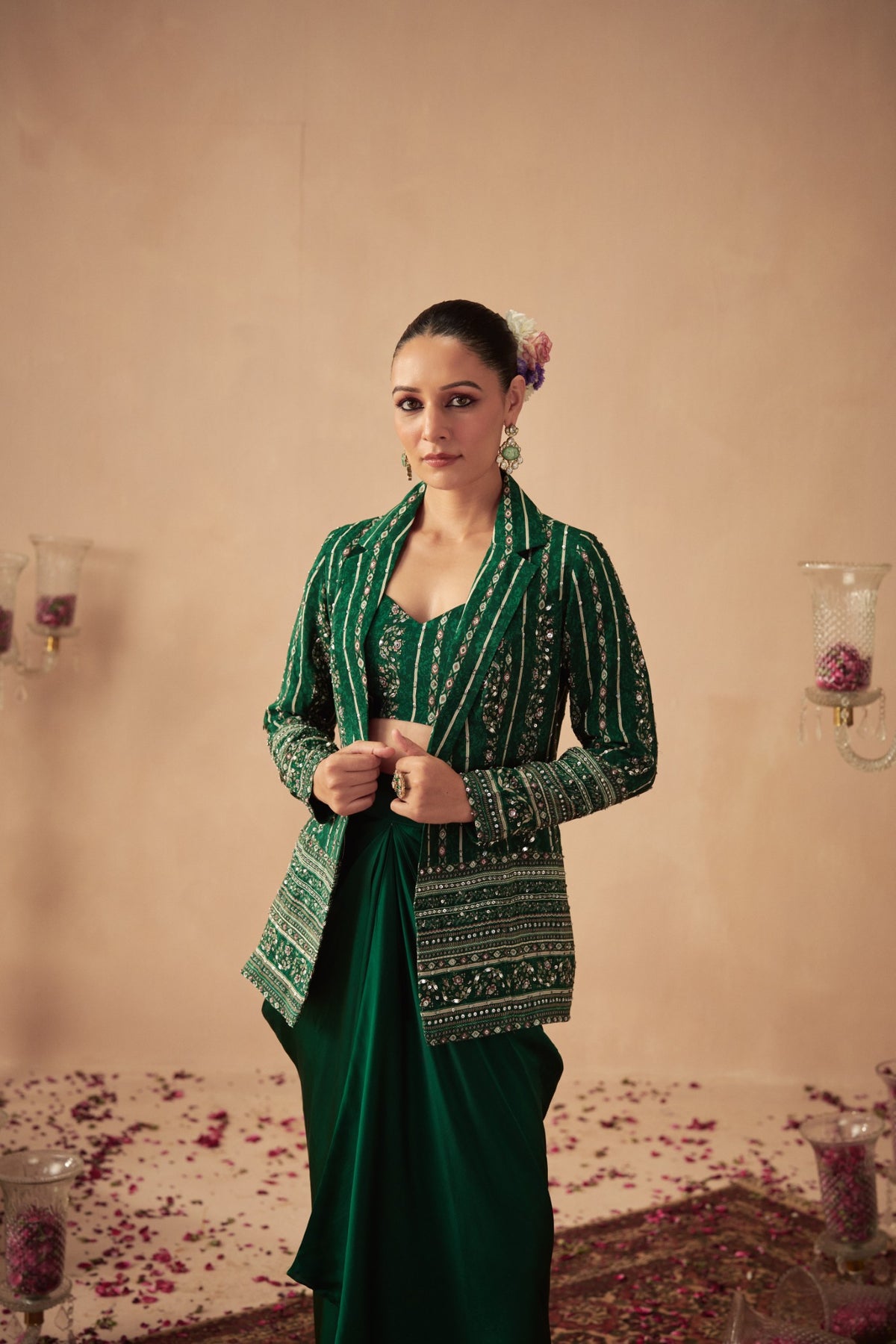 Featuring a green printed, hand-embroidered jacket. It is paired with a draped skirt in satin and printed bustier with hand-embroidery.