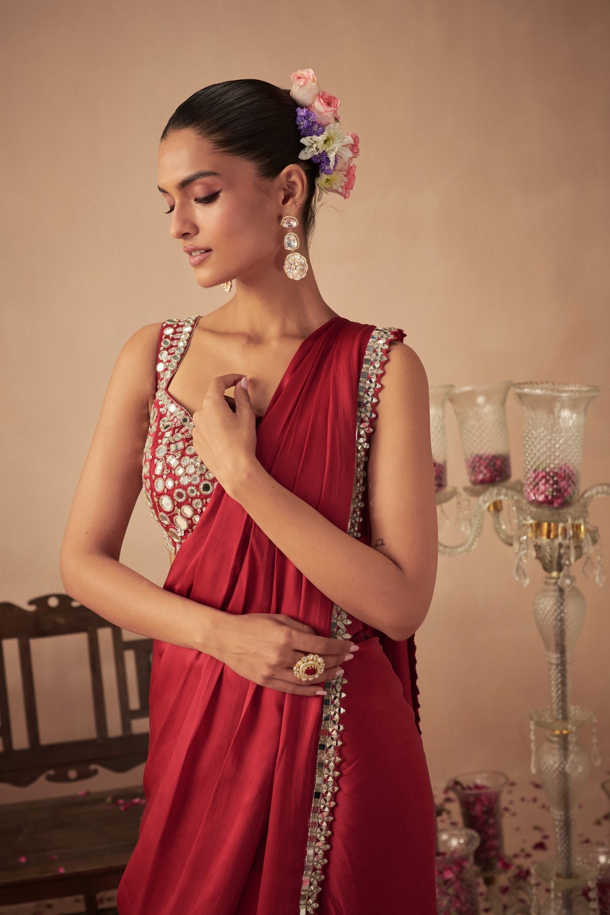 Featuring a red satin saree with mirror work embroidery on blouse and pallu.
