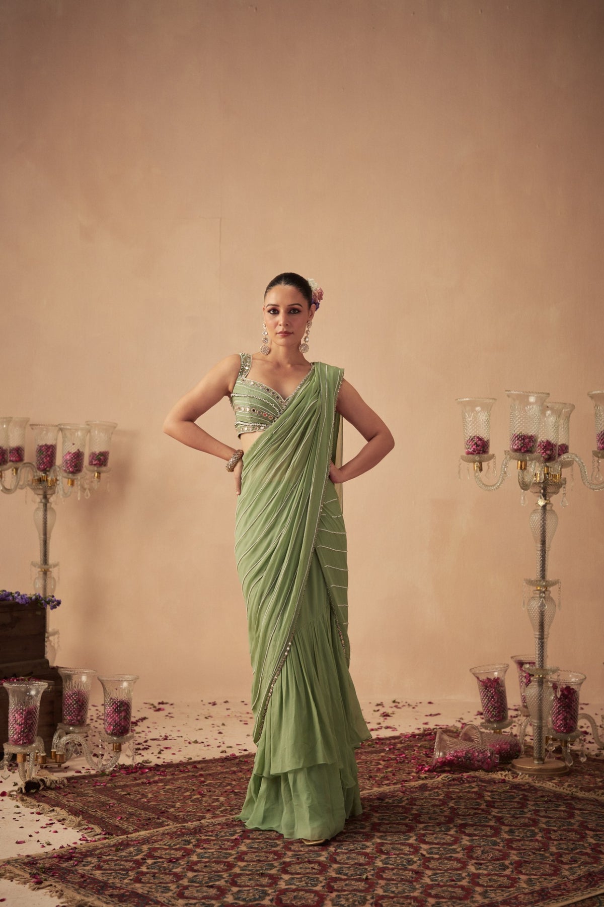 Featuring a sage green pre-draped saree with embroidered pallu.This comes with an embroidered blouse.
