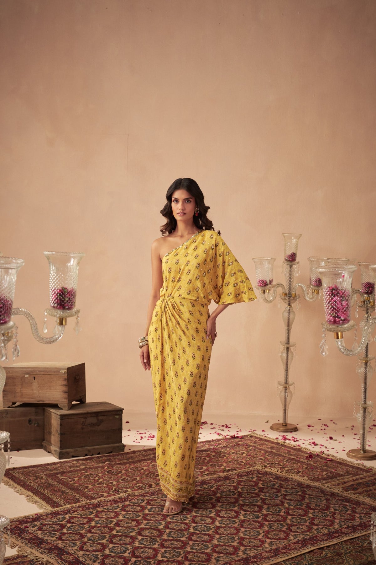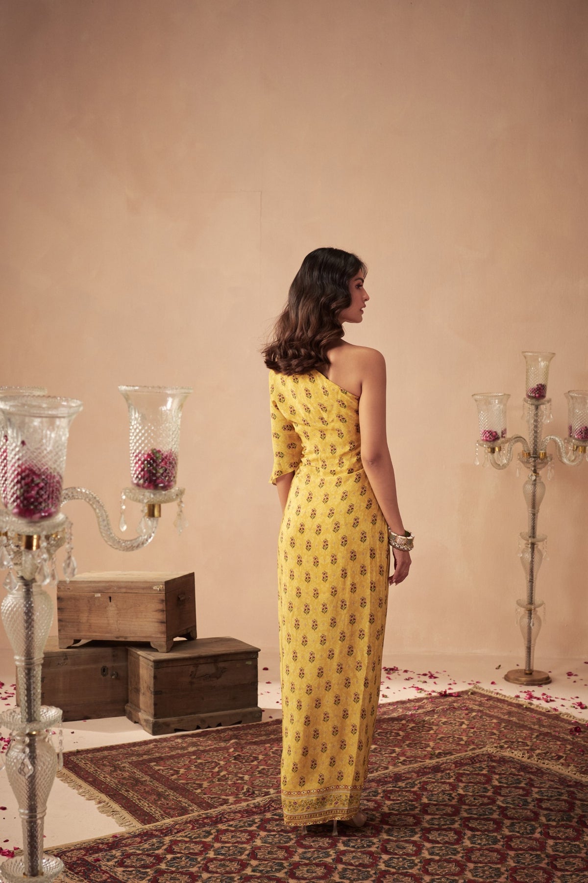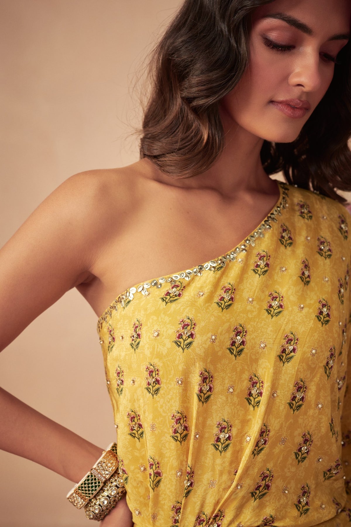 Featuring a yellow printed one-shoulder dress with a hand-embroidered bodice.