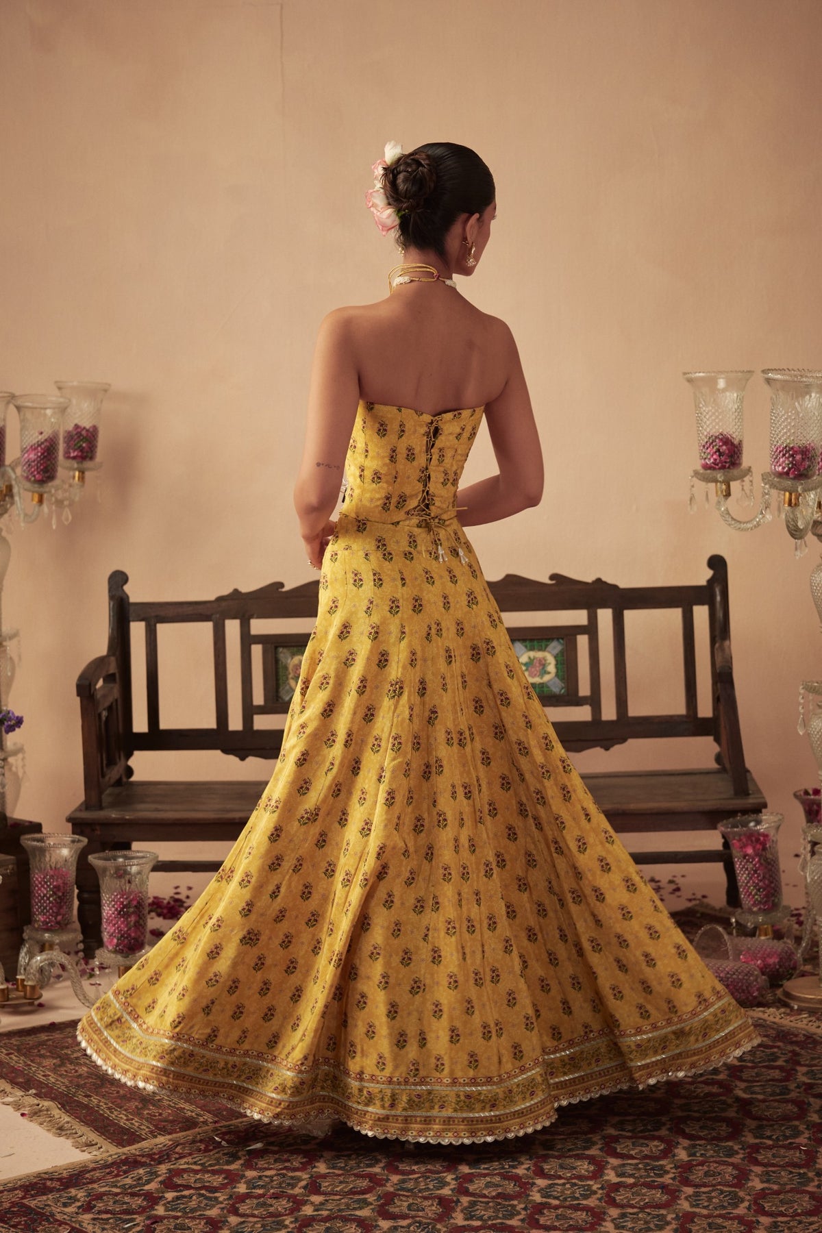Featuring a yellow printed lehenga paired with a hand-embroidered printed corset.