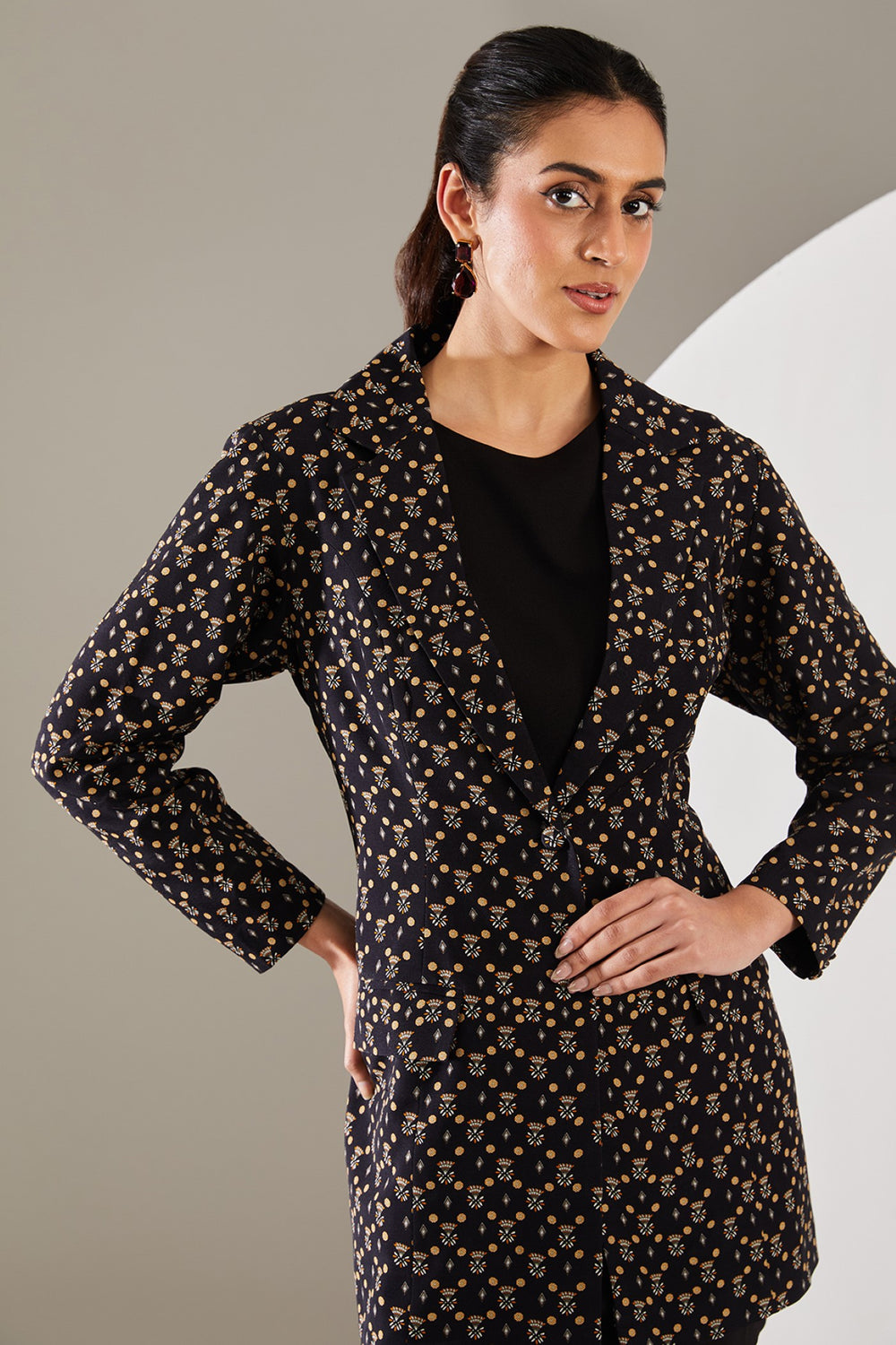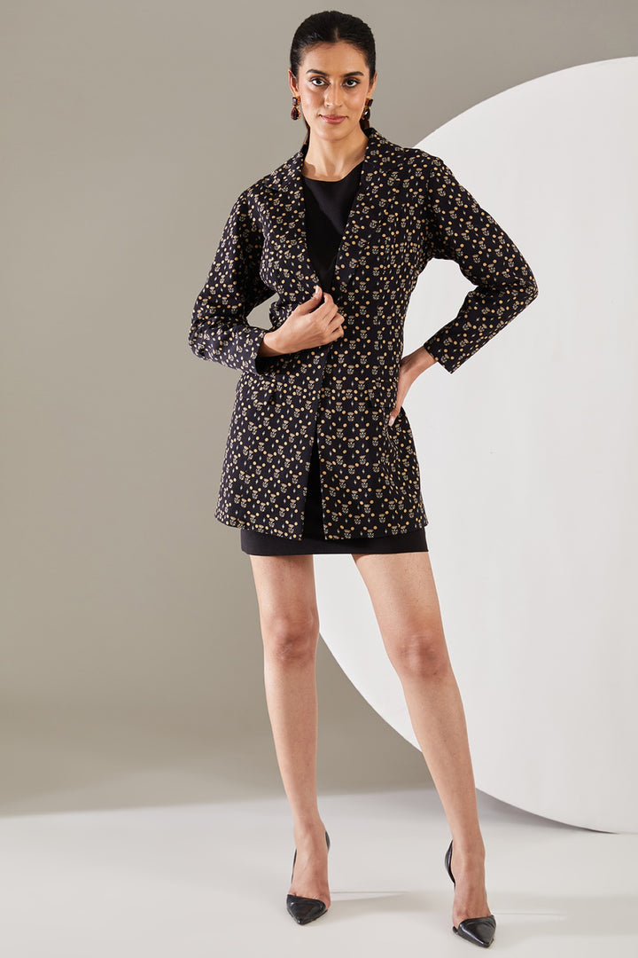 Featuring a solid black dress with a printed long blazer