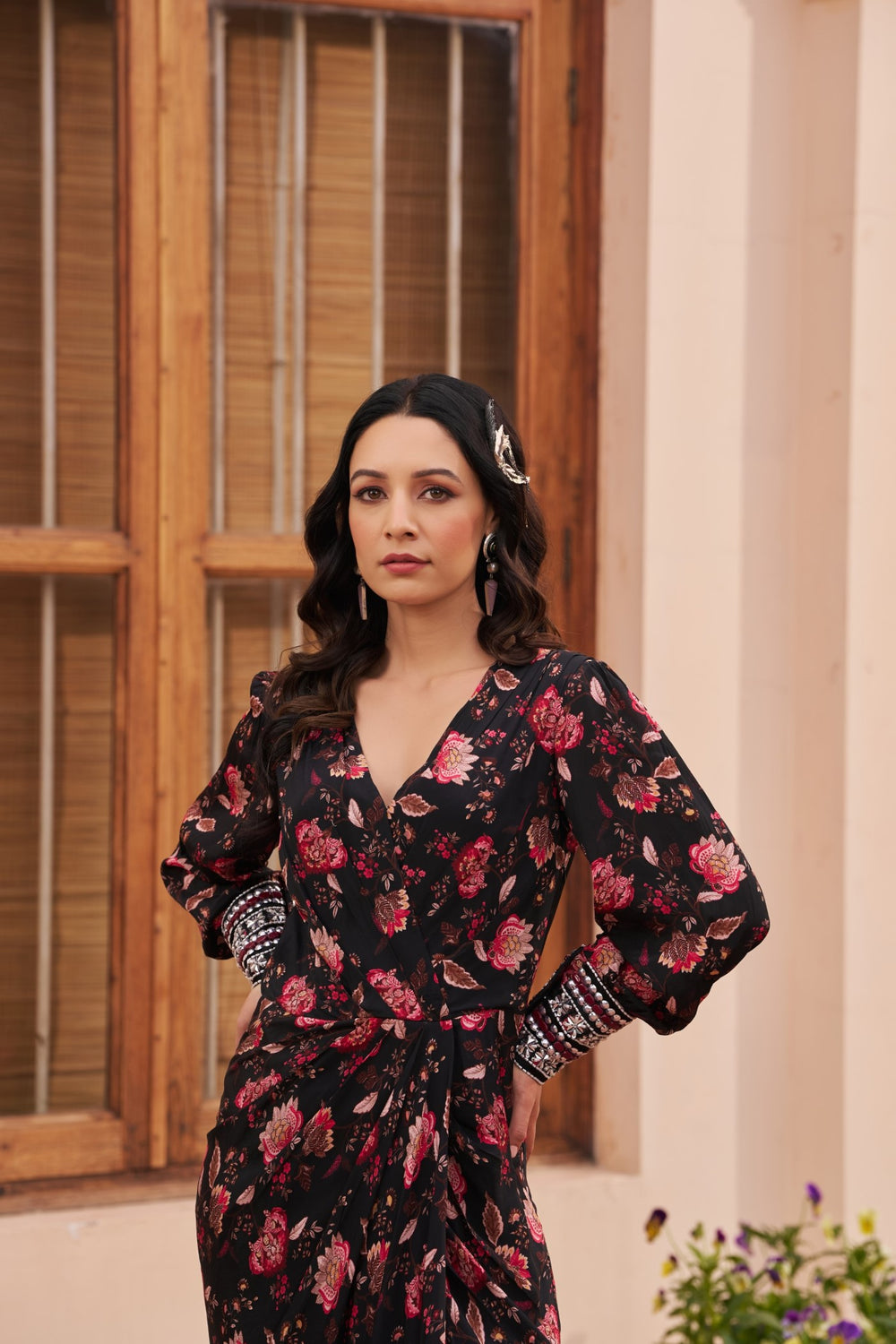 Featuring here black printed overlap style draped dress. This dress has hand embroidered cuff