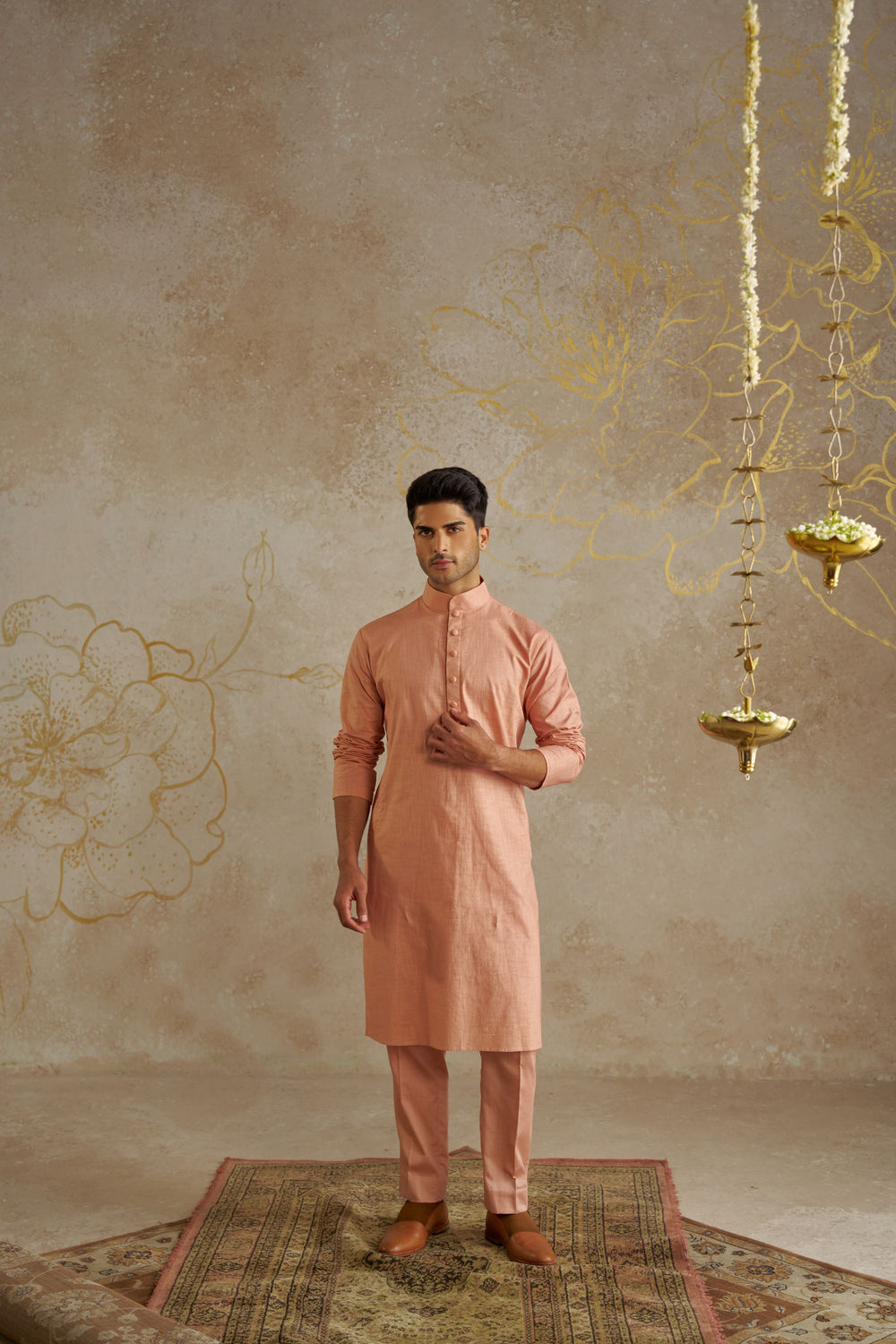 Featuring a light pink chinese collar kurta with pants.