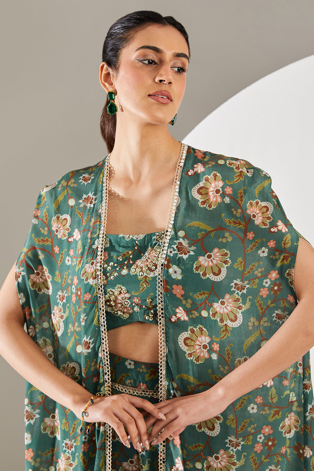 Featuring here a green printed blouse. It is paired with a printed pant and cape.