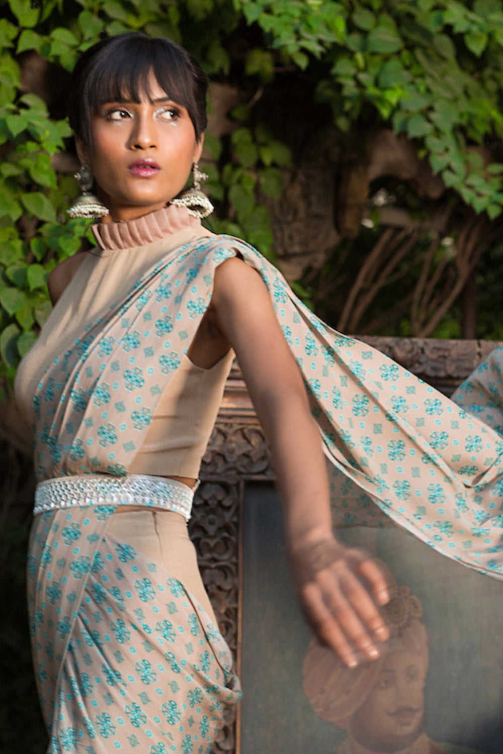 Featuring here a grey pants in crepe Fabric with attached printed drape. It comes with grey sleeveless blouse with organza pleating detail on the collar. This set also comes with an embroidered belt