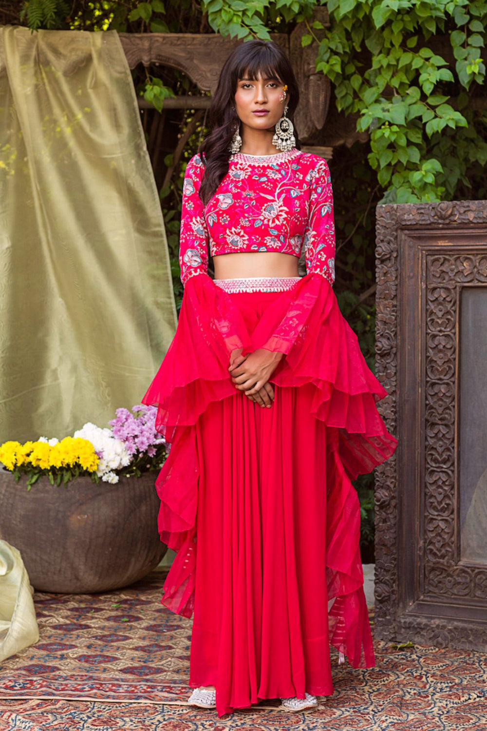 Saina Nehawal in red georgette gathered palazzo with a red printed blouse. It comes with organza pleated dupatta with sequins work on the border