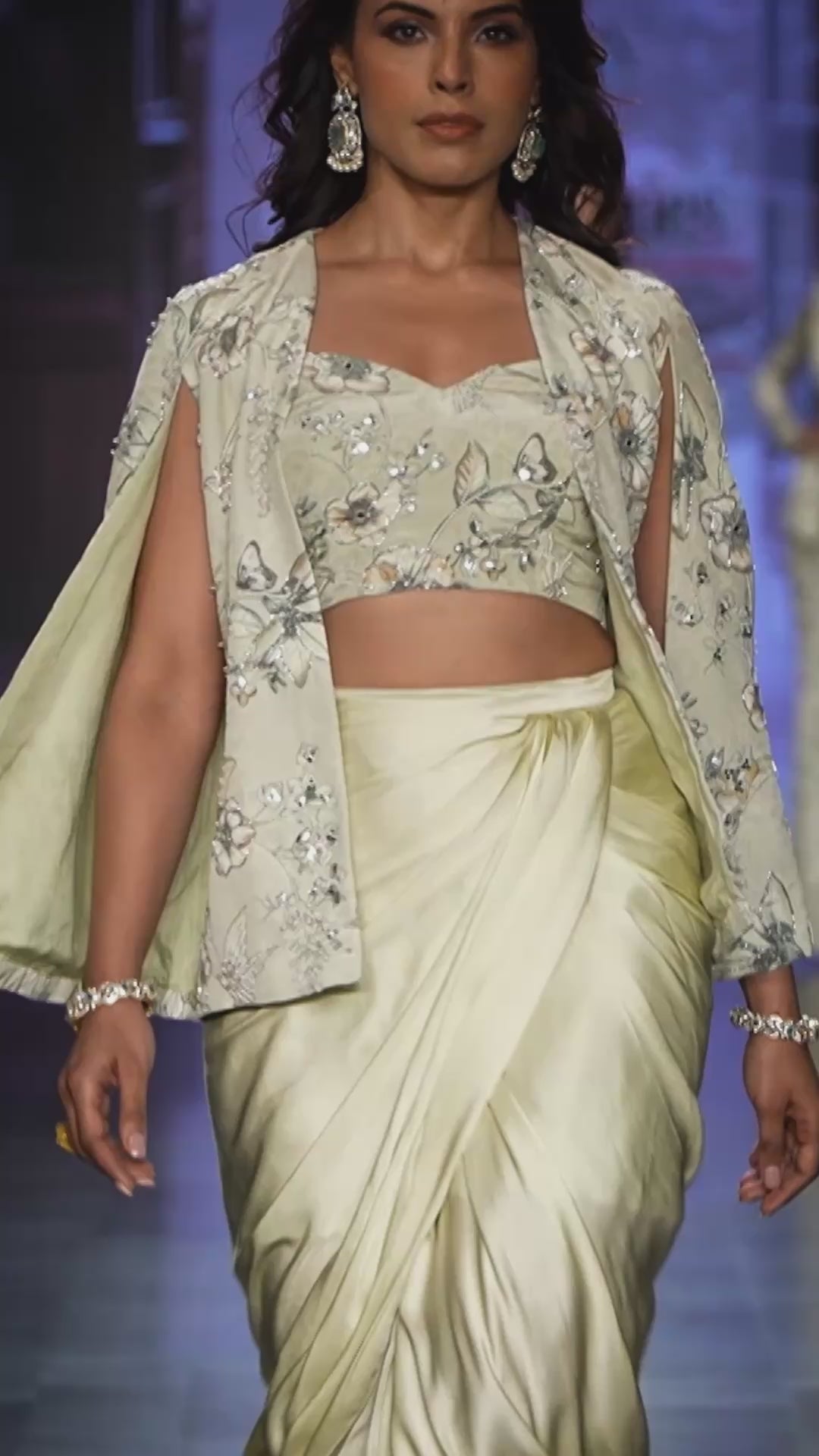 Featuring an ivory embroidered cape jacket. It is paired with an hand embroidered bustier and satin draped skirt.