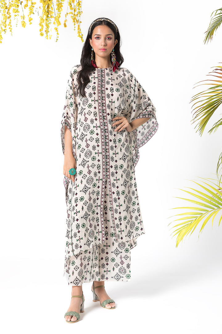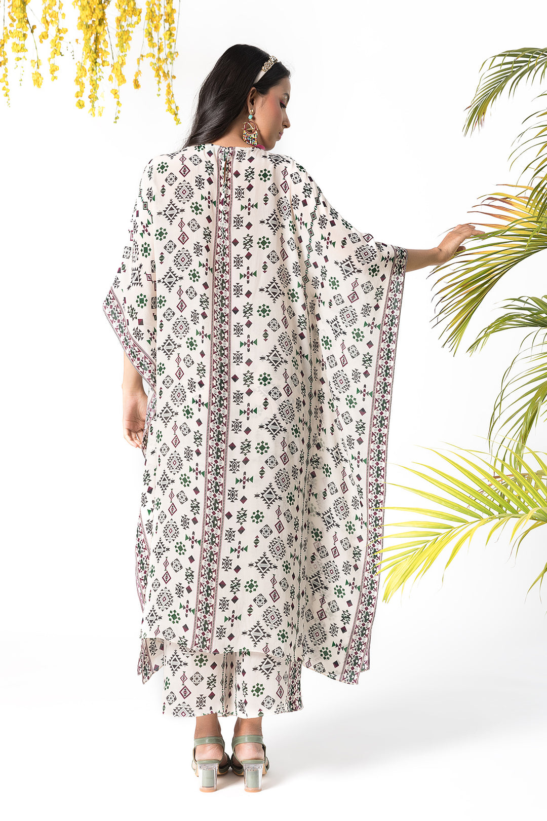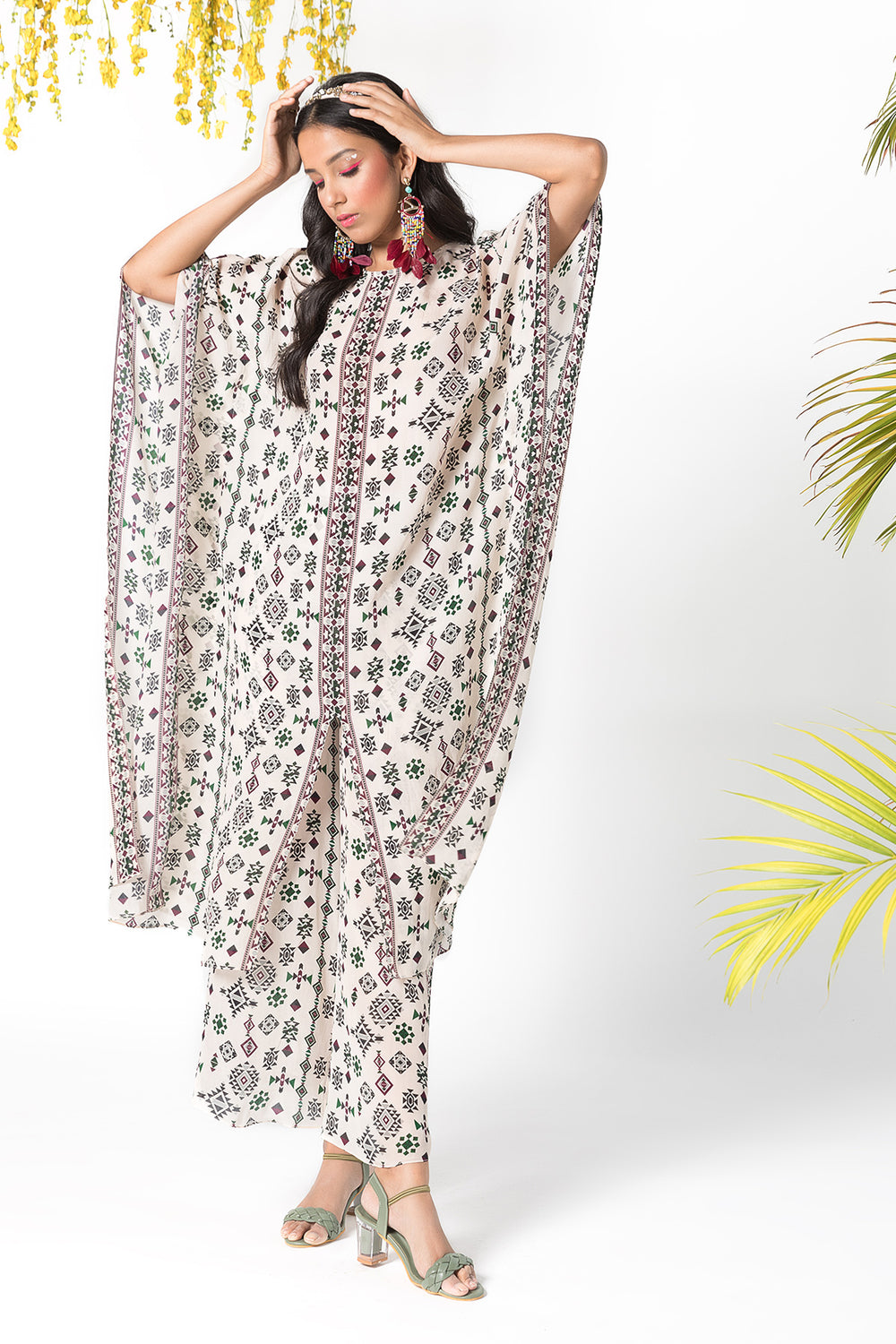 Featuring Here a ivory printed kaftan paired with a palazzo