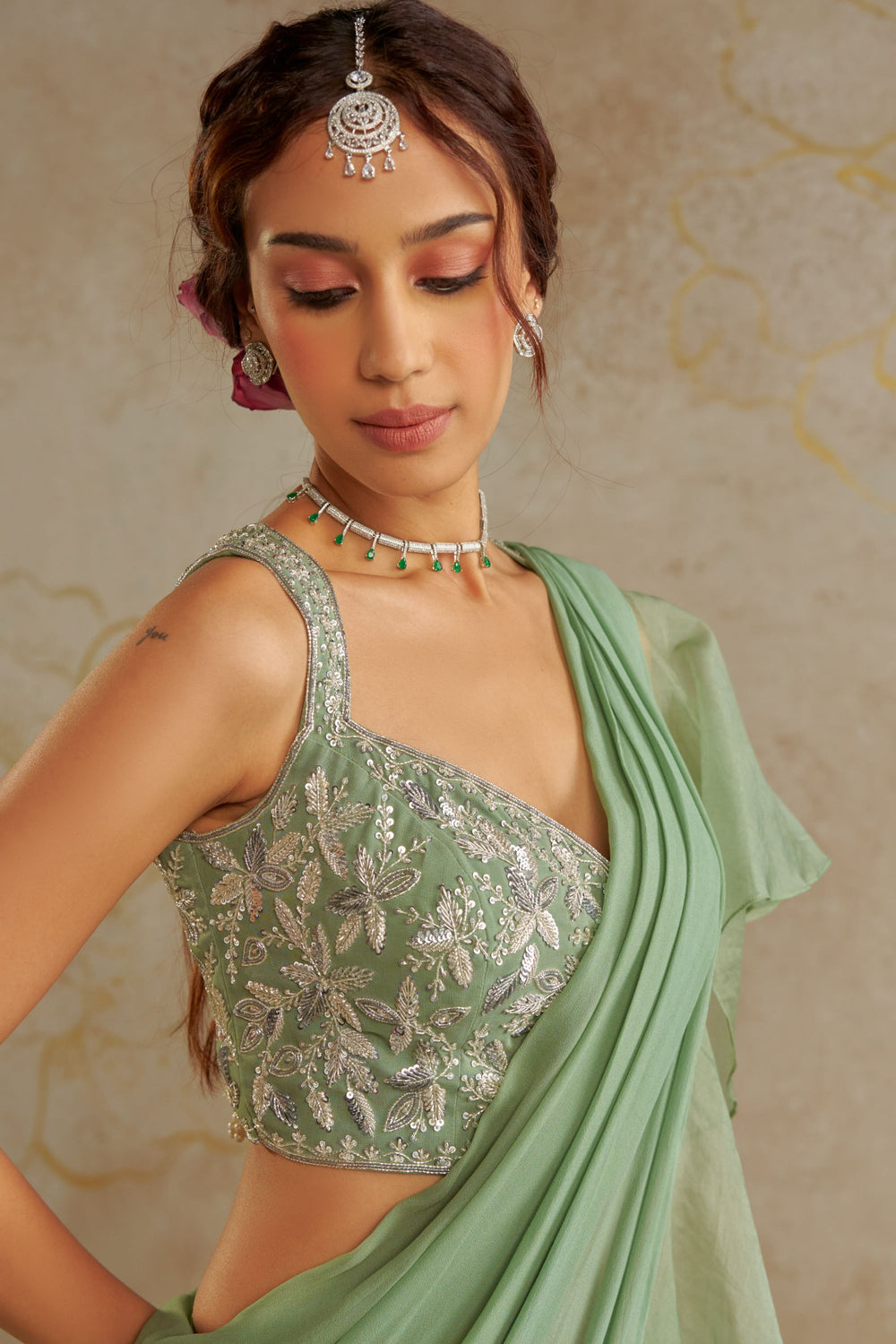 Featuring a sage green pre- draped saree with organza frill. It is paired with a hand-embroidered blouse.