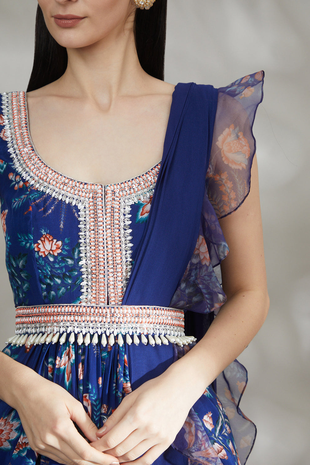 Featuring here a royal blue organza palazzo with front open short kurta. This comes with a hand embroidered belt and frill dupatta