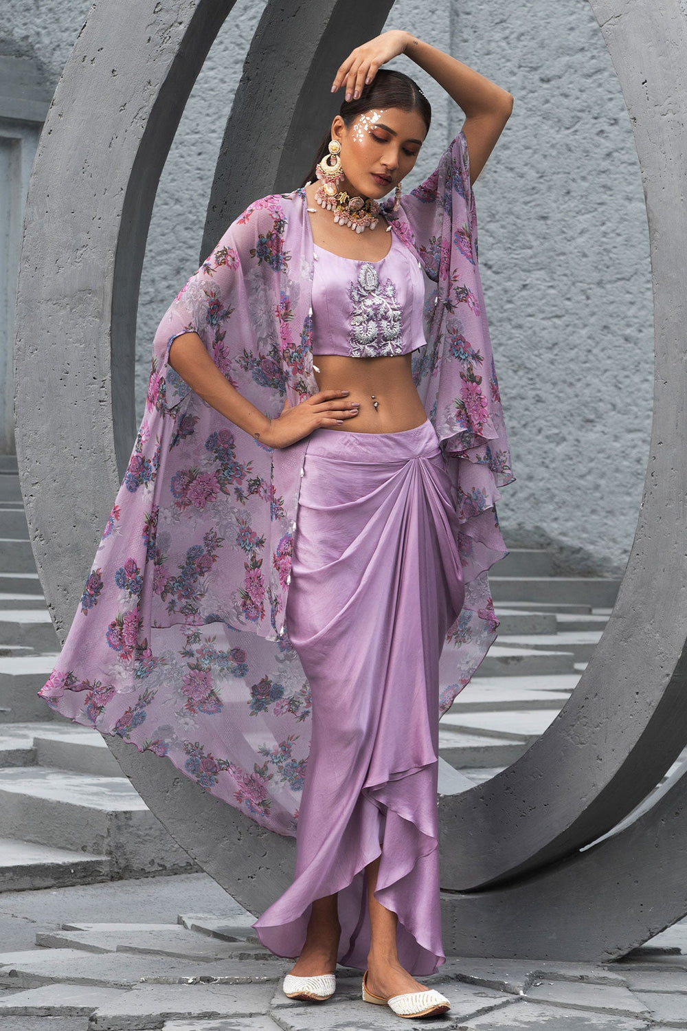Featuring a lavender printed cape. This set has an embroidered sleeveless blouse and draped satin skirt