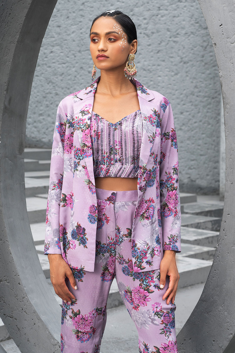 Featuring a three piece lavender printed pant suit. It comes with an embroidered and printed inner