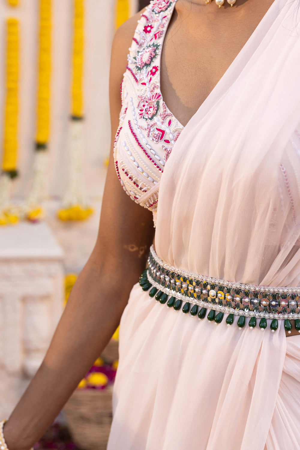 Featuring here a light peach pant saree. This set comes with a hand-embroidered blouse and embroidered belt.