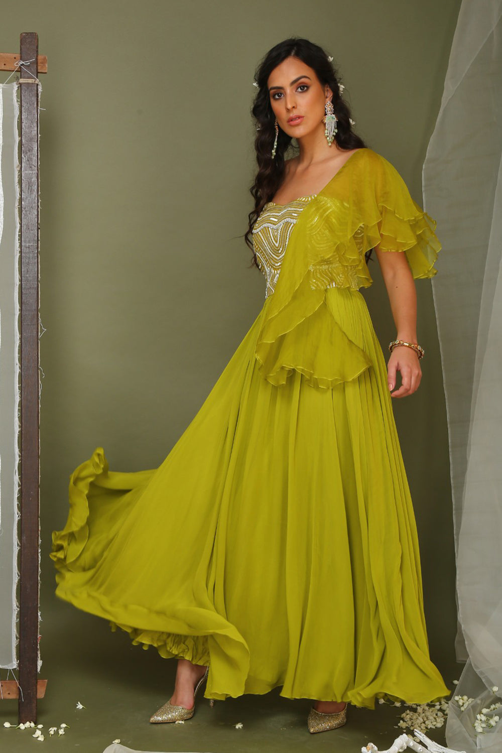Featuring here a lime green flowy anarkali in georgette Fabric with organza frills on one side. It has a pearl and sequins embroidered yoke