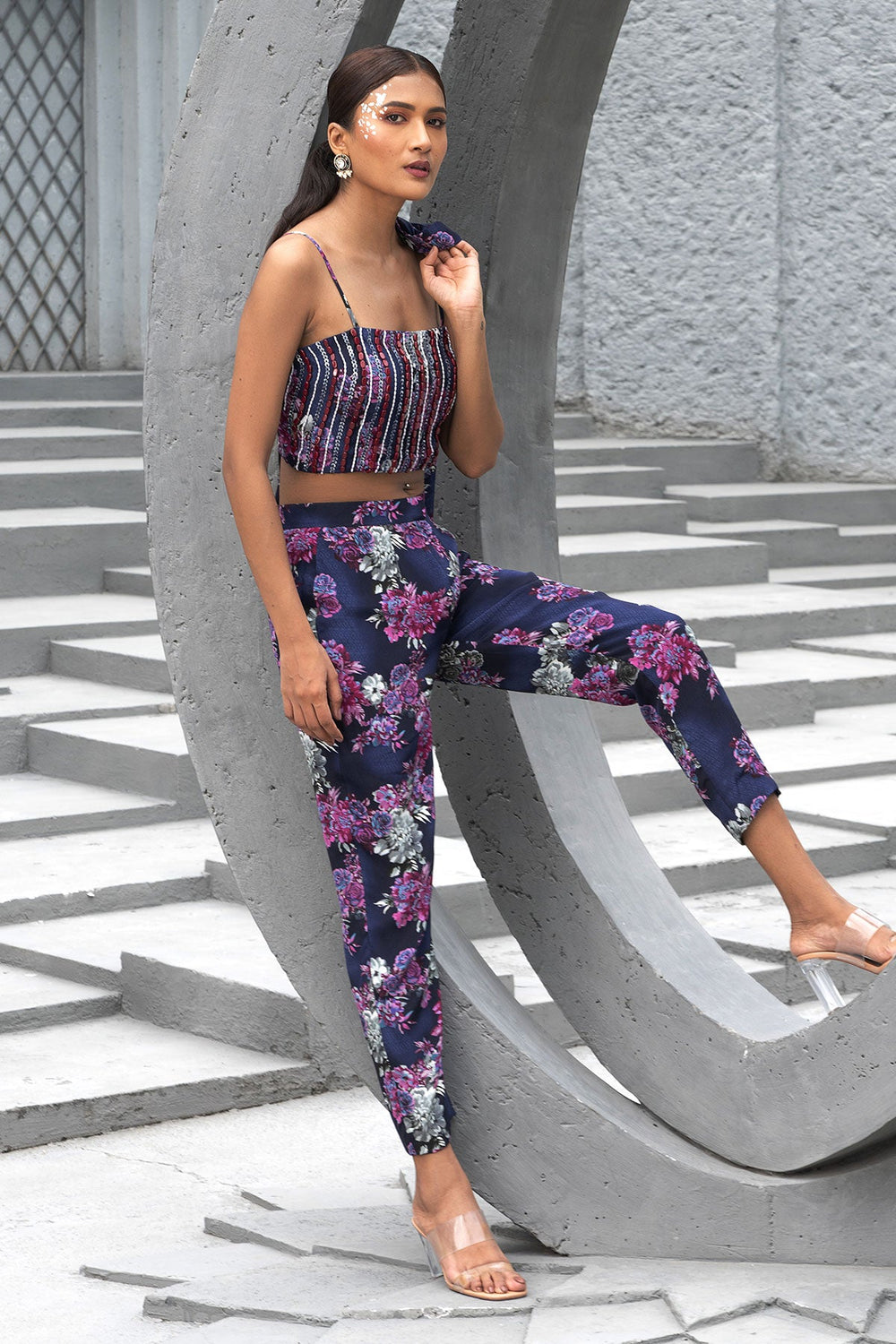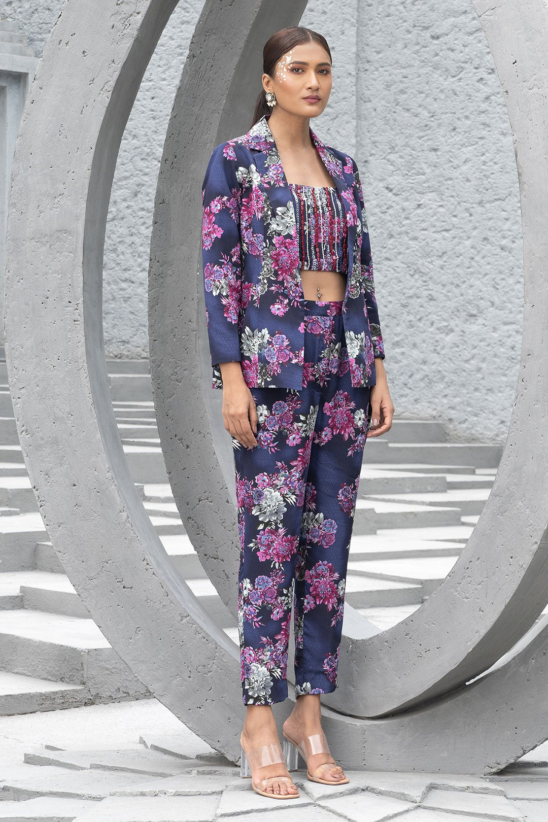 Featuring a navy blue printed three piece pant suit set. This set has an embroidered inner