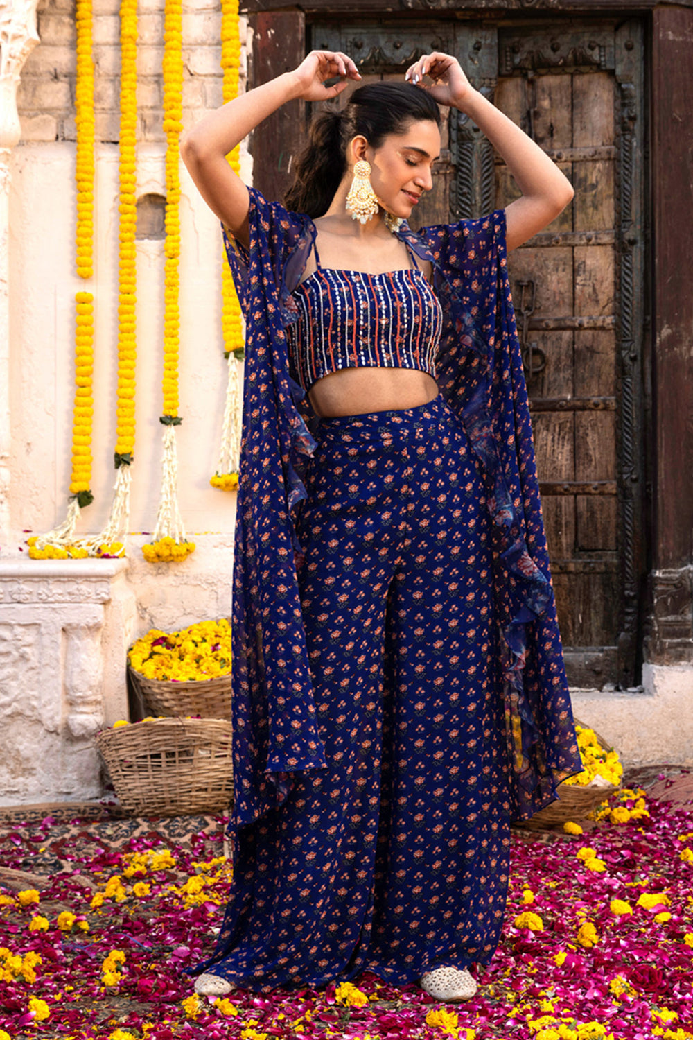Featuring Here a palazzo set in georgette. This has an embroidered inner and cape.