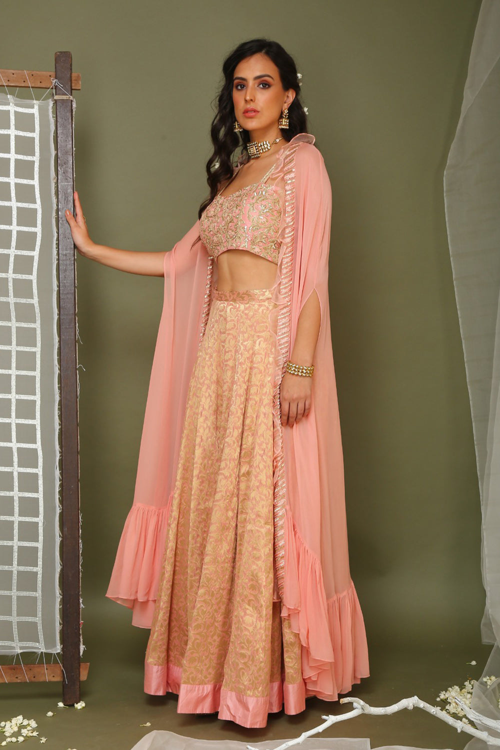 Peach brocade lehenga comes with zardosi embroidered crop blouse and a georgette embroidered cape to be worn on top