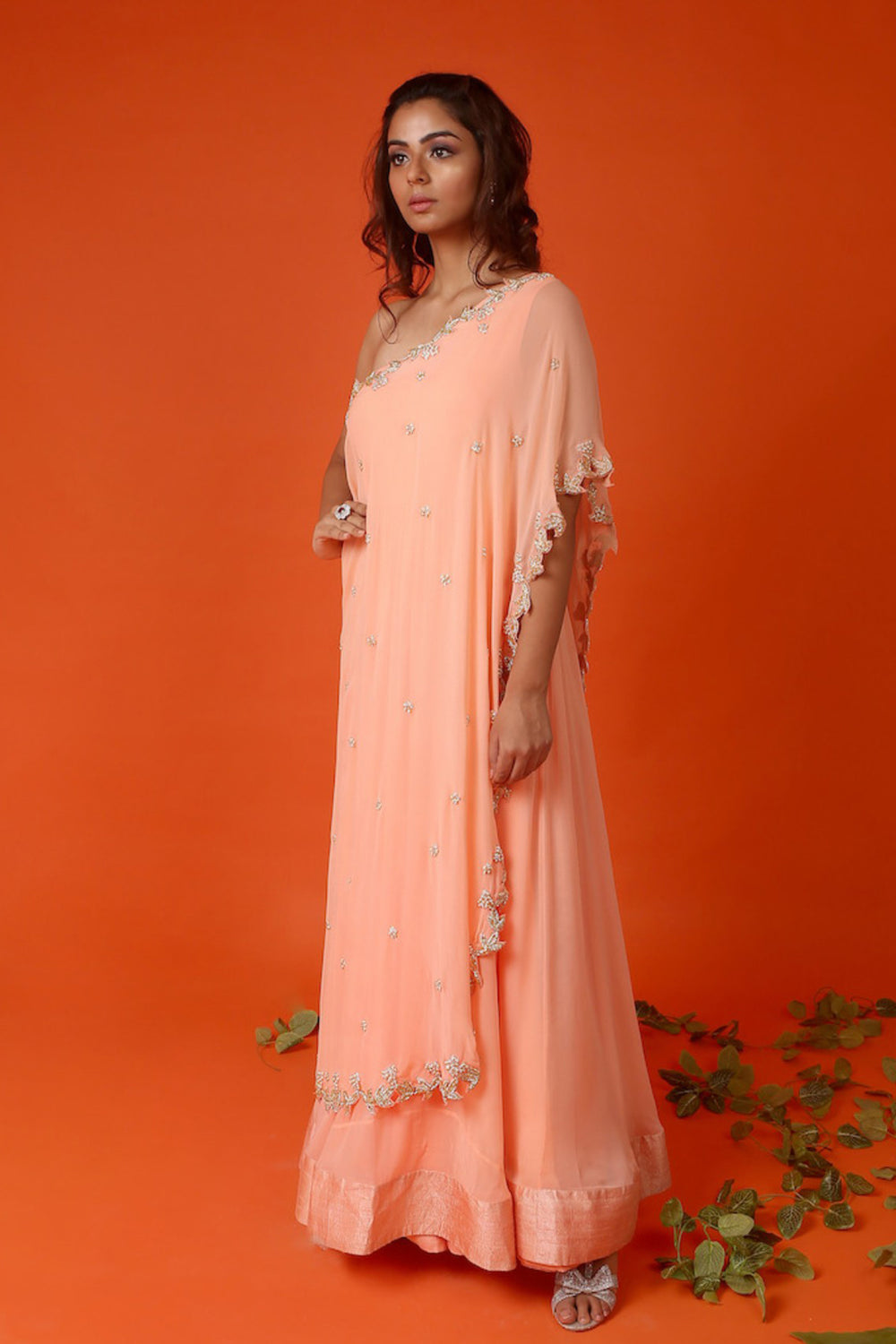 Featuring a peach one shoulder cape anarkali. This is a two piece set with a peach flowy georgette anarkali and a separate zardosi embroidered cape to be worn on top.