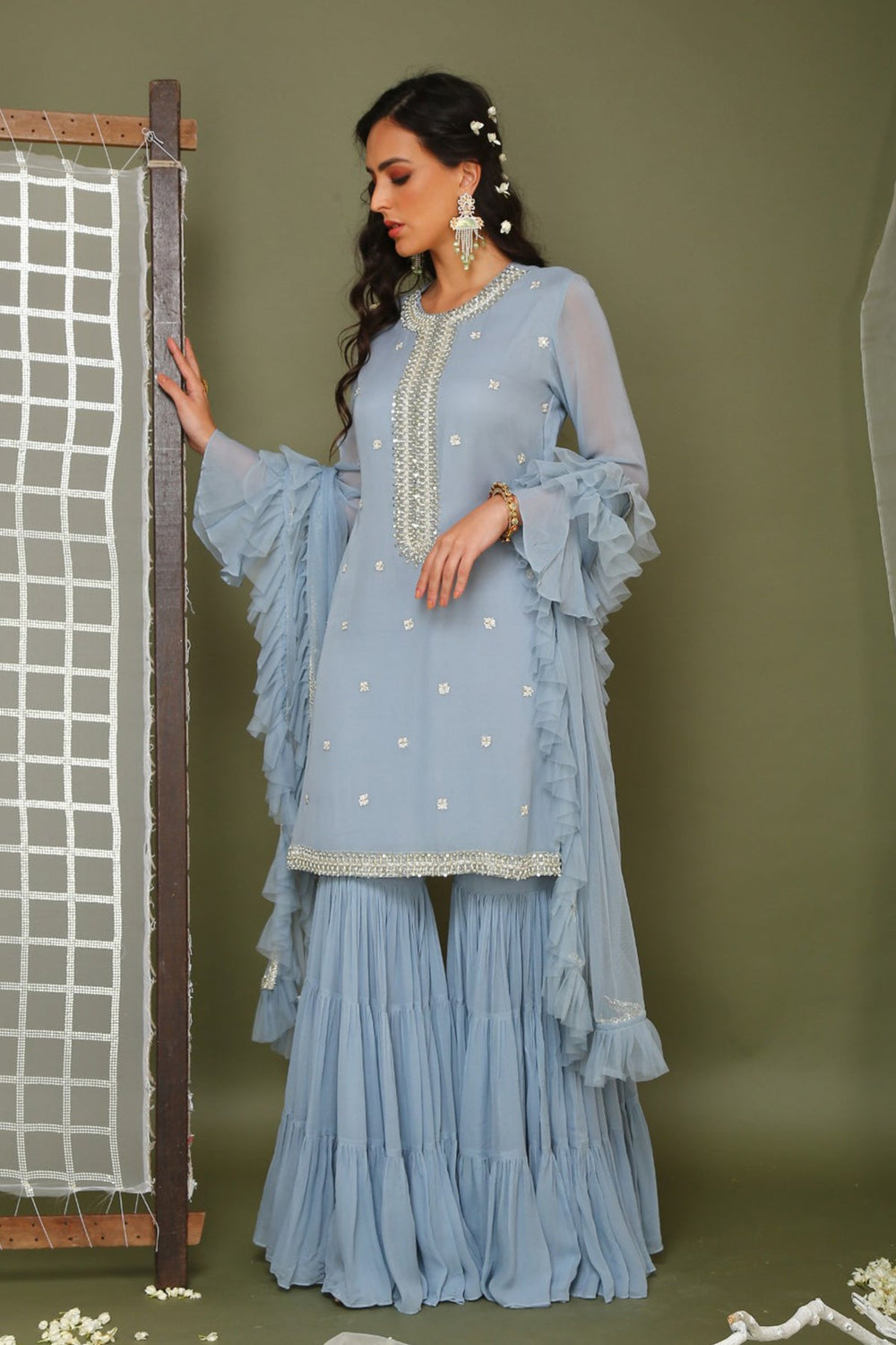 Featuring here a powder blue georgette sharara with a short kurta, with sequins and pearl hand embroidery on it. It comes with net frill dupatta