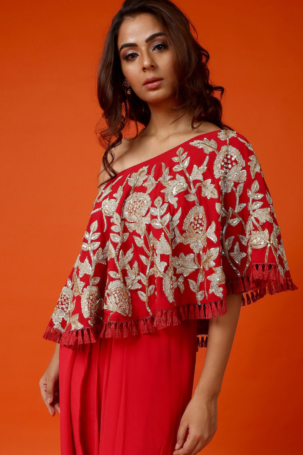Red one shoulder cape with heavy zardosi work comes with a red georgette tube and red crepe dhoti pants