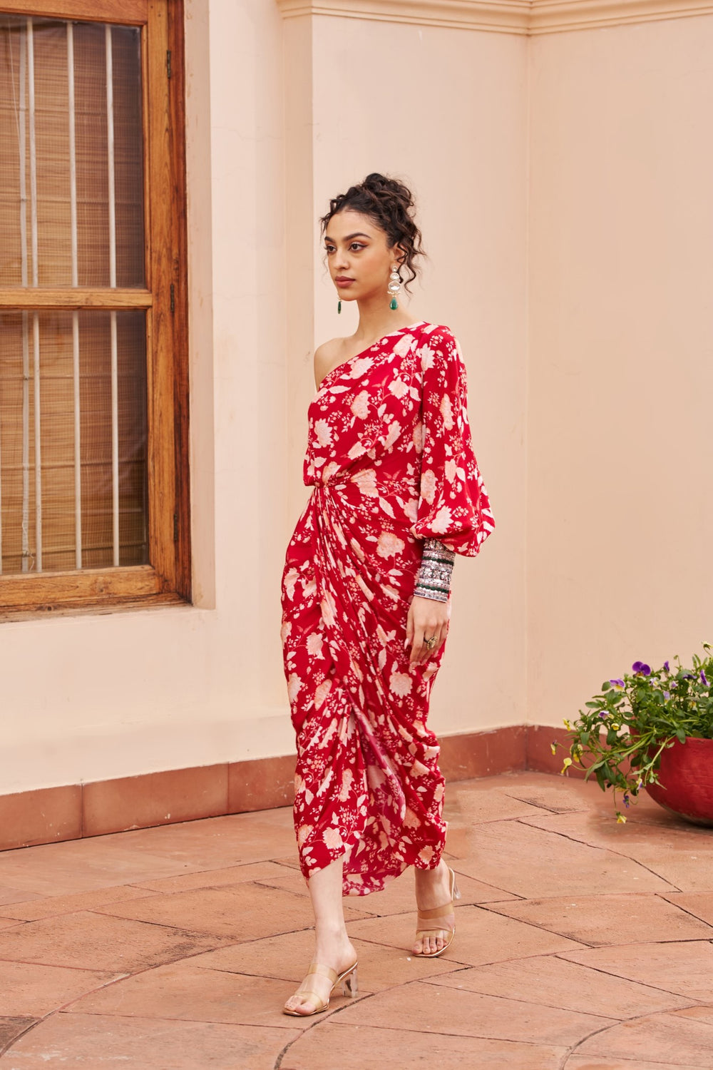 Featuring here a red printed one-shoulder draped dress. This dress has hand embroidered cuffs.