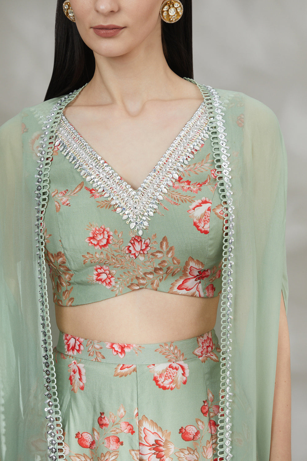 Featuring here a sage green printed blouse with embroidered neckline. It is paired with a printed sharara and cape in georgette base.