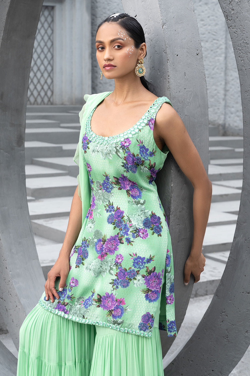 Featuring a sea green georgette sharara with a sea green printed kurta with hand embroidery on the neckline. It comes with a sea green ruffle dupatta.