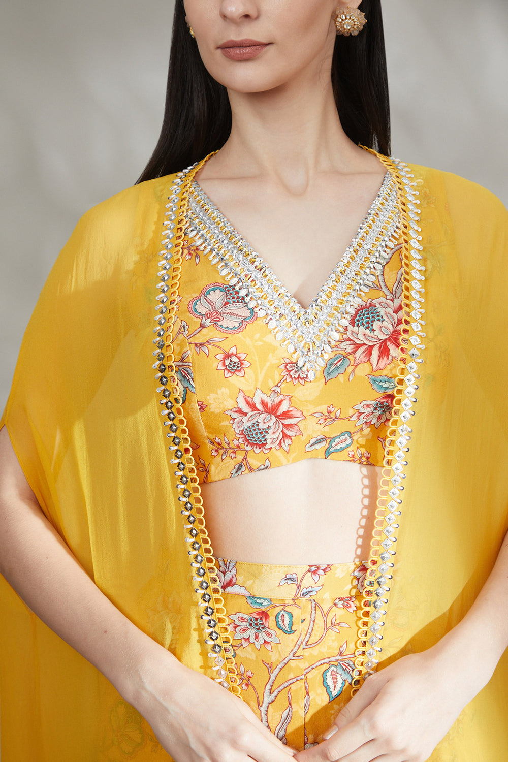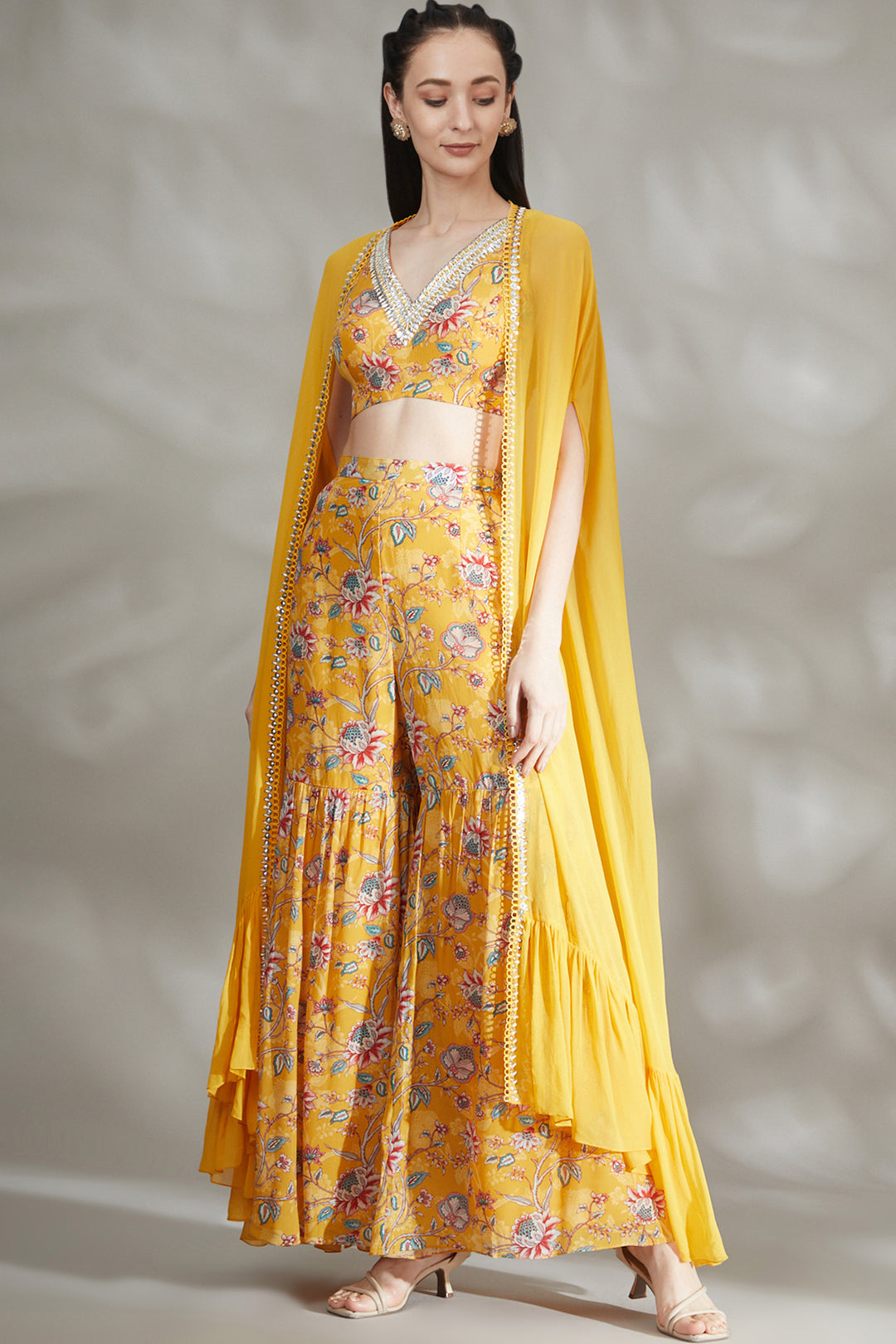 Featuring here a yellow printed blouse with embroidered neckline. It is paired with a printed sharara and cape in georgette base.